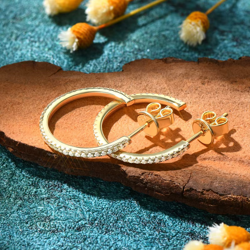 Modern and refined: C-Hoop earrings in 925 sterling silver, adorned with 80 D-color moissanite stones (1mm / 0.005ct each) for a radiant, shimmering effect. Available in White Gold and Yellow Gold plating.