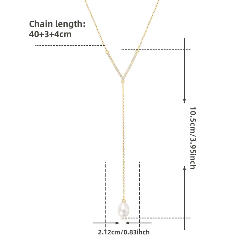 Graceful and timeless: Y-shaped pendant necklace crafted in 925 sterling silver, featuring a natural 8mm freshwater pearl with delicate zircon accents. Available in White Gold and Yellow Gold plating, this piece embodies elegance and sophistication — a perfect gift for any occasion.